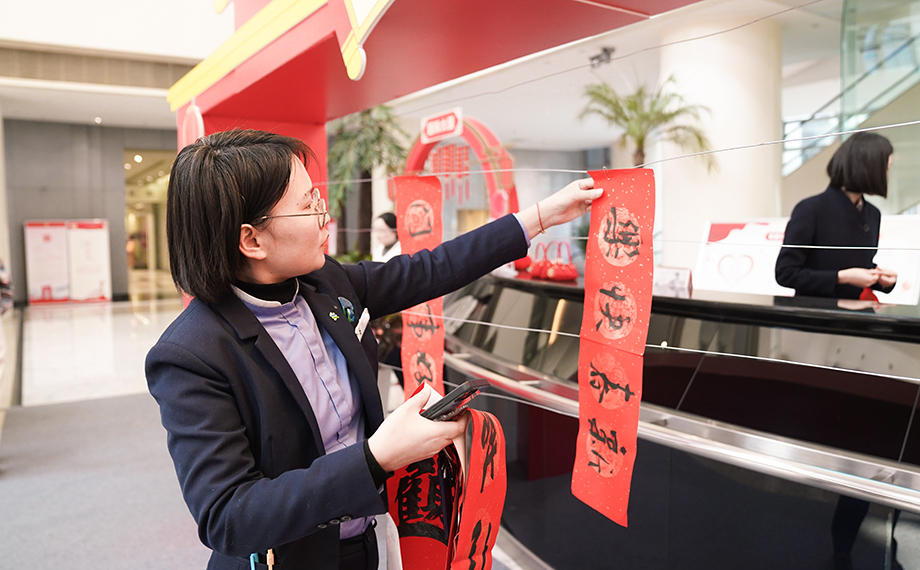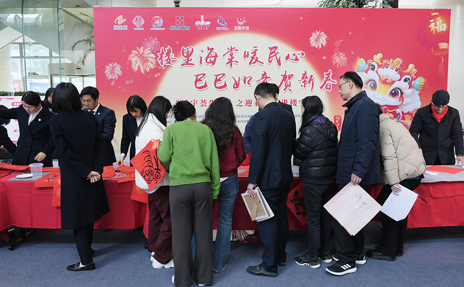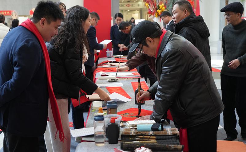 活動現場一片歡樂祥和的節日氛圍,前來領取春聯及福字的員工絡繹不絕,大家手捧著新鮮出爐的春聯,臉上洋溢著幸福的笑容,對書法家們的精湛技藝贊不絕口。一位在國際大廈工作的員工表示:“在超市選購春聯雖然方便,但現場手寫的春聯更有溫度、更有年味。我拿到了一副很合我心意的手寫春聯,一定要把這份福氣帶回家。”短短兩個小時內,現場就送出了約500副春聯和500個福字,將滿滿的福氣傳遞到每個人手中。