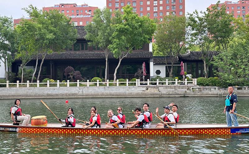 蘇州國際友緣龍舟隊成立于2021年,已多次亮相金雞湖端午龍舟賽場。這支隊伍的成員來自五湖四海,“是緣分讓來自世界各地的我們相聚蘇州,大家熱愛這座城市并組建了這支戰隊,所以取名‘友緣’?!鳖I隊Shirley Tian介紹道。一直以來,蘇州國際友緣龍舟隊始終保持著開放與活力,隊員們每年都會更新迭代,旨在讓更多國際友人體驗劃龍舟的樂趣。
