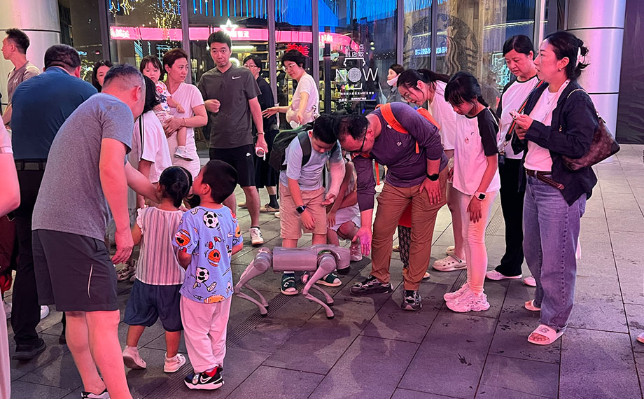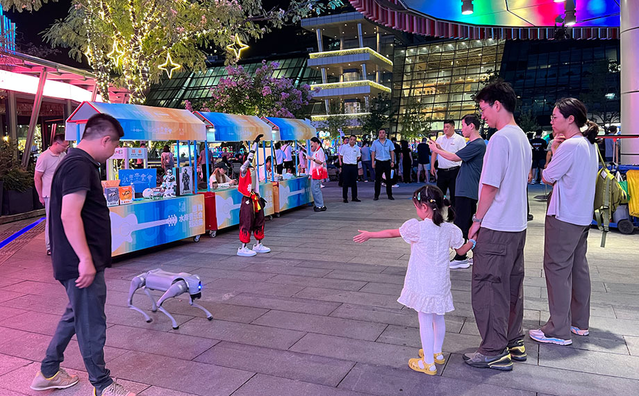 天幕下,變幻著燈光的地面噴泉讓愛玩水的萌娃樂此不疲,而臨近的水岸音樂會甄選市集上,哪吒造型的機器人、身姿靈活的機器狗也與大家握握手、跳個舞熱情互動,讓往來的大朋友、小朋友心動不已。“水岸音樂會積聚人氣,實現了很好的引流,不僅提升了市民的生活質感,也為我們企業推廣搭建了全新的場景。機器人正當熱點,我們與圓融合作,在圓融天幕和月光碼頭都設置了展臺,提供機器人的表演、互動,以及配套小機器人的售賣,對于展示企業形象、能力,展現園區高科技活力,都是很好的平臺?!卑朔綑C器人經理朱錦介紹說。