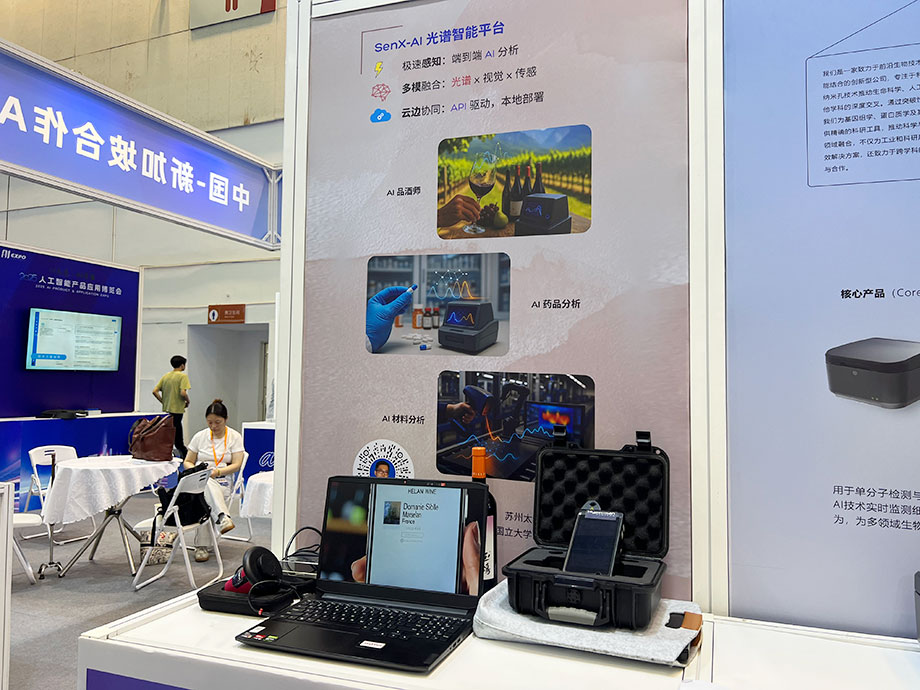 不用品嘗,如何快速了解葡萄酒的產(chǎn)地、品質(zhì)?太赫信息科技的光譜+AI解決方案就能快速“解題”。“我們的‘AI品酒師’,通過便攜式光譜設(shè)備,結(jié)合譜的數(shù)據(jù)、AI算法,能夠?qū)频娘L(fēng)味、產(chǎn)地進(jìn)行快速分析和判斷。這種無損檢測(cè)對(duì)消費(fèi)者而言可以更好地選擇喜歡的酒,對(duì)酒莊而言則能夠在釀造過程中更好地調(diào)控風(fēng)味、提升品質(zhì)。”公司創(chuàng)始人兼CEO張楠介紹,太赫信息科技是新加坡國立大學(xué)蘇州研究院的孵化企業(yè),此次展會(huì)除了“AI品酒師”,還帶來了AI藥品檢測(cè)、AI材料分析兩個(gè)將先進(jìn)人工智能算法與光譜分析技術(shù)深度結(jié)合的產(chǎn)品。其中AI藥品檢測(cè)已經(jīng)用于公共安全行業(yè)對(duì)危險(xiǎn)藥品、受管制藥品的快速識(shí)別,AI材料分析則在風(fēng)電葉片等復(fù)合材料的缺陷識(shí)別中擔(dān)當(dāng)起在線級(jí)別檢測(cè)的重任。