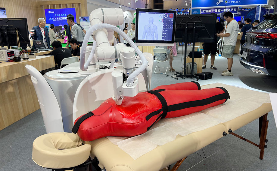 安韋澤是新加坡科技研究局的首個(gè)海外分支機(jī)構(gòu)——新科研引入園區(qū)的一家科技企業(yè),此次展會(huì)帶來按摩機(jī)器人EMMA,將千年中醫(yī)經(jīng)絡(luò)理論與前沿機(jī)器人技術(shù)相融合,重新書寫“推拿”技藝的時(shí)代傳承。“EMMA集3D視覺及多種高精度傳感器與一體,可以實(shí)時(shí)生成人體三維數(shù)據(jù)圖、感知人體背部的肌肉緊張度;同時(shí)采用仿生設(shè)計(jì)和柔性力控,結(jié)合實(shí)時(shí)壓力反饋系統(tǒng),能夠精準(zhǔn)按摩,動(dòng)態(tài)調(diào)整力度與節(jié)奏。”安韋澤項(xiàng)目工程師陳雪介紹,EMMA每一次服務(wù)都會(huì)生成報(bào)告,為后續(xù)服務(wù)提供指導(dǎo)和參考,形成個(gè)性化理療方案。“目前,我們?cè)趫@區(qū)已落地研發(fā)和生產(chǎn),相關(guān)產(chǎn)品在中醫(yī)診所、康復(fù)機(jī)構(gòu)已有應(yīng)用,正在申請(qǐng)國家醫(yī)療器械注冊(cè)流程,未來將讓優(yōu)質(zhì)康復(fù)資源惠及更多人群。”