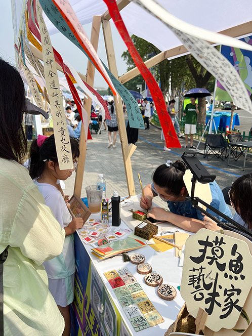 當天,來自區內高校、企業帶來非遺作品、輕食飲品、休閑文旅、運動裝備、文創周邊等,共同組成了多元業態匯聚的湖畔市集,吸引了不少市民停留駐足、拍照打卡。