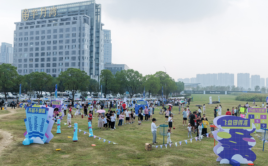 而在陸上游戲區,現場設置了百步穿楊(投壺)、蘇超踢毽子、蘇超九宮格、飛盤擲得準等5項趣味挑戰,每項挑戰成功可獲得一張通關卡,集齊3張即可領取精美獎品。市民們有序排隊,積極參與游戲,一邊觀戰一邊為挑戰者支招,挑戰區不時爆發出叫好聲和加油聲。
