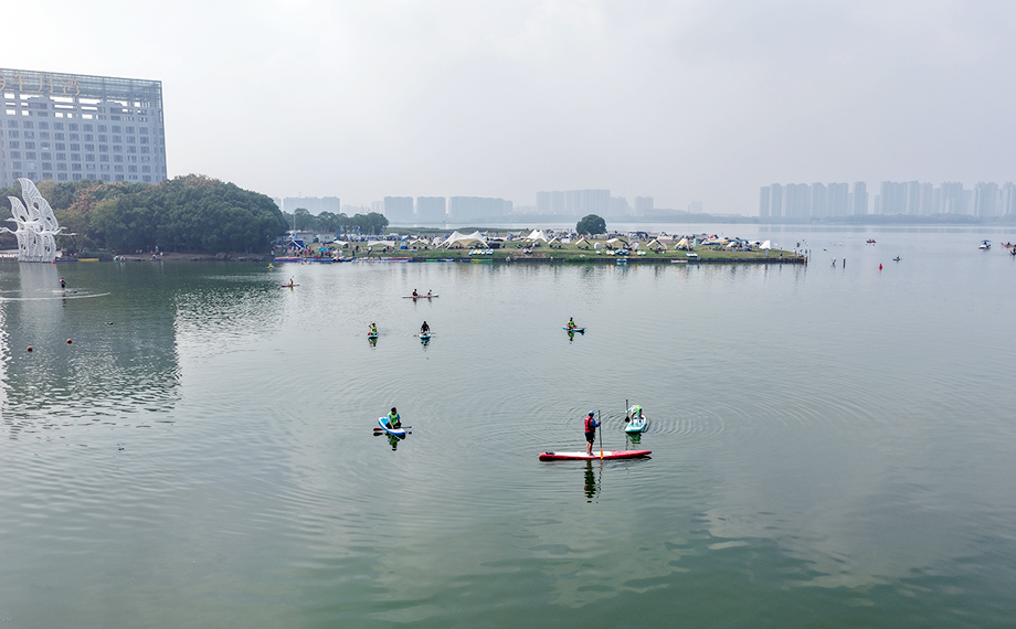 在水上項目體驗區,通過前期線上預約的市民穿戴好裝備,在教練的指導下逐步掌握平衡技巧和御水技術,在前行中感受秋日獨墅湖畔的都市風光與自然之美。