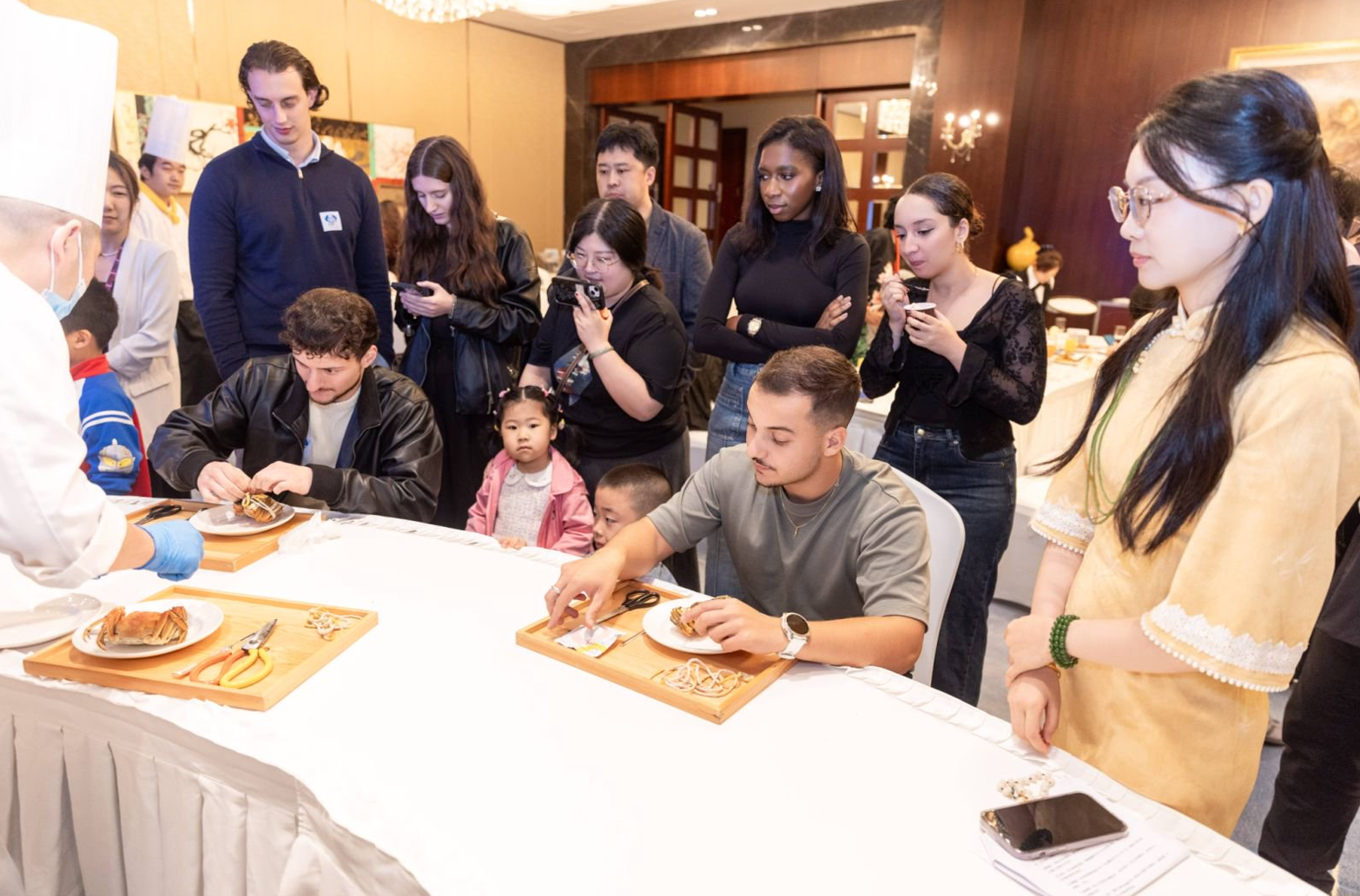 在品嘗美味的同時(shí),豐富多彩的文化互動(dòng)體驗(yàn)也吸引著眾多參與者。蘇式綠豆糕制作區(qū)里,在大廚的悉心指導(dǎo)下,不少外國(guó)朋友親手制作出精致的江南點(diǎn)心;陽澄湖大閘蟹標(biāo)準(zhǔn)拆解演示,則讓食客們領(lǐng)略到江南飲食文化的深厚底蘊(yùn)。“筷子挑戰(zhàn)賽”和“盲品食物猜猜猜”等互動(dòng)游戲不僅拉近了彼此的距離,也讓中外文化交流更加輕松愉悅,現(xiàn)場(chǎng)不時(shí)傳來陣陣笑聲。