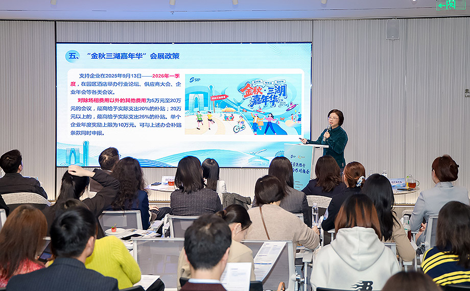 會上,園區(qū)商務(wù)局服貿(mào)處詳細(xì)介紹了園區(qū)辦會辦展專項政策,以及各類規(guī)模會議補(bǔ)貼內(nèi)容。作為“金秋?三湖嘉年華”系列讓利舉措之一,園區(qū)首次出臺企業(yè)在酒店辦展辦會的補(bǔ)貼政策,以真金白銀惠企利民。自2025年9月13日起至2026年一季度,企業(yè)在園區(qū)酒店舉辦各類會議會展活動,除場租費(fèi)用外的其他費(fèi)用可享受20-25%補(bǔ)貼,最高10萬。