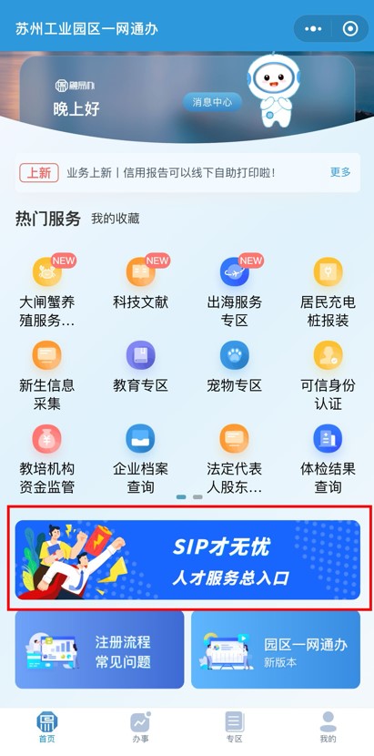 方式二:關(guān)注“蘇州工業(yè)園區(qū)發(fā)布”微信公眾號,點(diǎn)擊下方“一網(wǎng)通辦”菜單欄,進(jìn)入后點(diǎn)擊“SIP才無憂”人才服務(wù)總?cè)肟凇?/p>