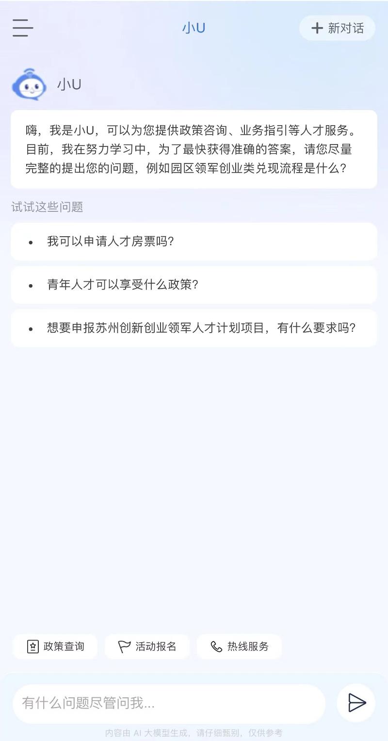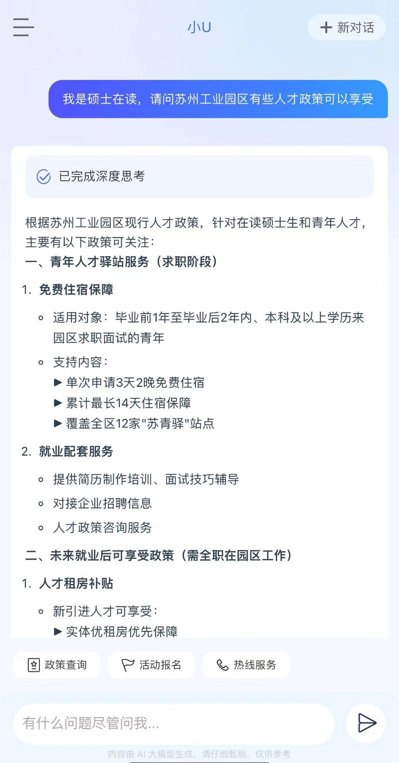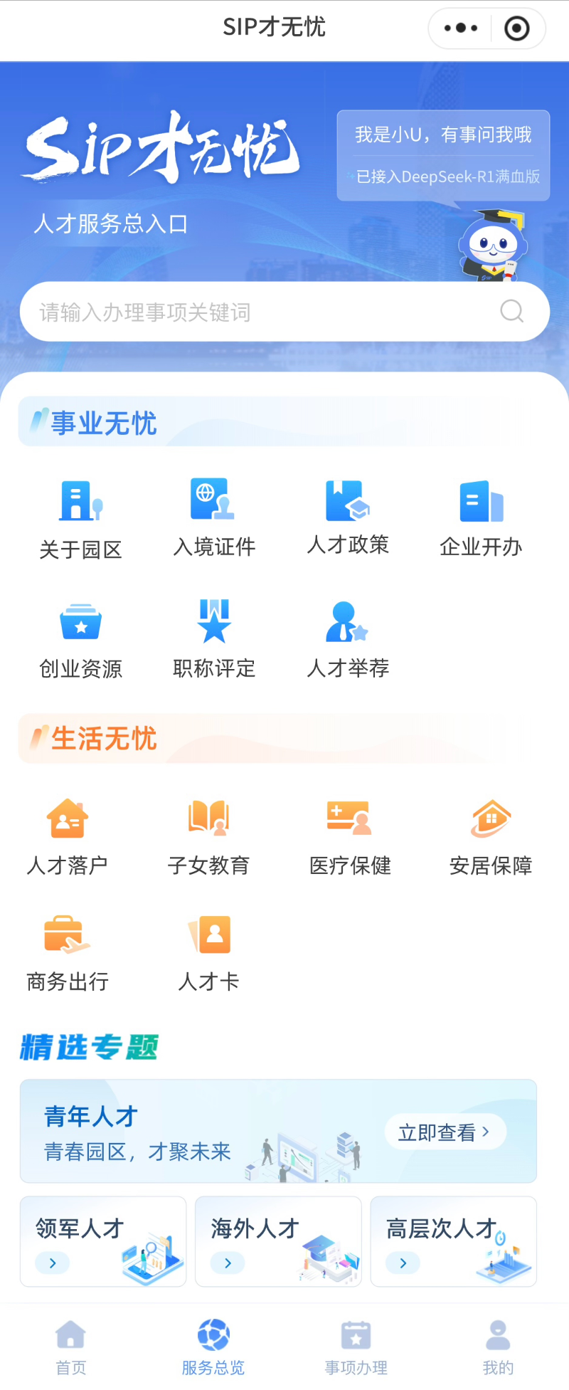 “SIP才無憂”深度聚焦提升人才的使用體驗(yàn),通過接入DeepSeek-R1“滿血版”,全新推出首個高智版AI助手“小U”,構(gòu)建智能化人才服務(wù)體系,實(shí)現(xiàn)“政策秒配、服務(wù)無界”。