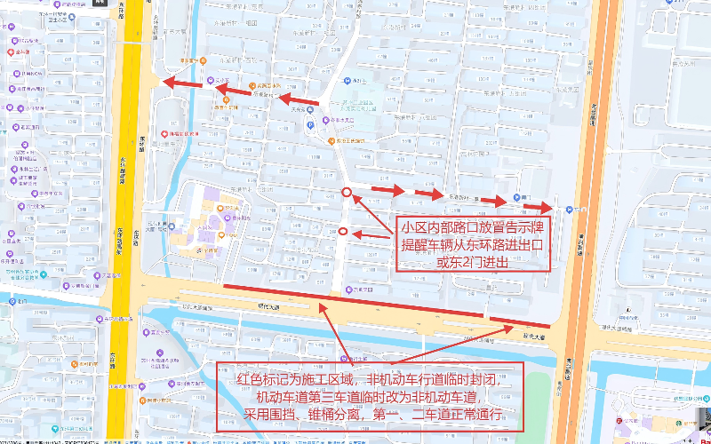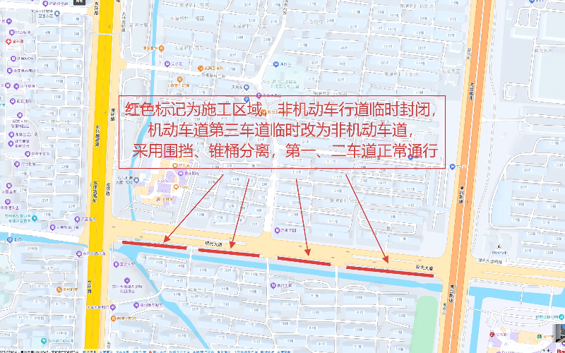 因道路交通導(dǎo)改情況復(fù)雜,該段需分段施工,將南北兩側(cè)分段,預(yù)計(jì)施工工期5天。為保證現(xiàn)場安全,施工期間,施工路段的非機(jī)動車行道臨時(shí)封閉,機(jī)動車道第三車道臨時(shí)改為非機(jī)動車道,采用圍擋、錐桶分離,非施工人員禁止入內(nèi),第一、二車道正常通行,請過往市民按照現(xiàn)場施工標(biāo)志提示有序通行,服從現(xiàn)場疏導(dǎo)人員指揮,小心慢行。如有條件,可盡量提前擇道繞行,給出行帶來不便,敬請廣大市民諒解。