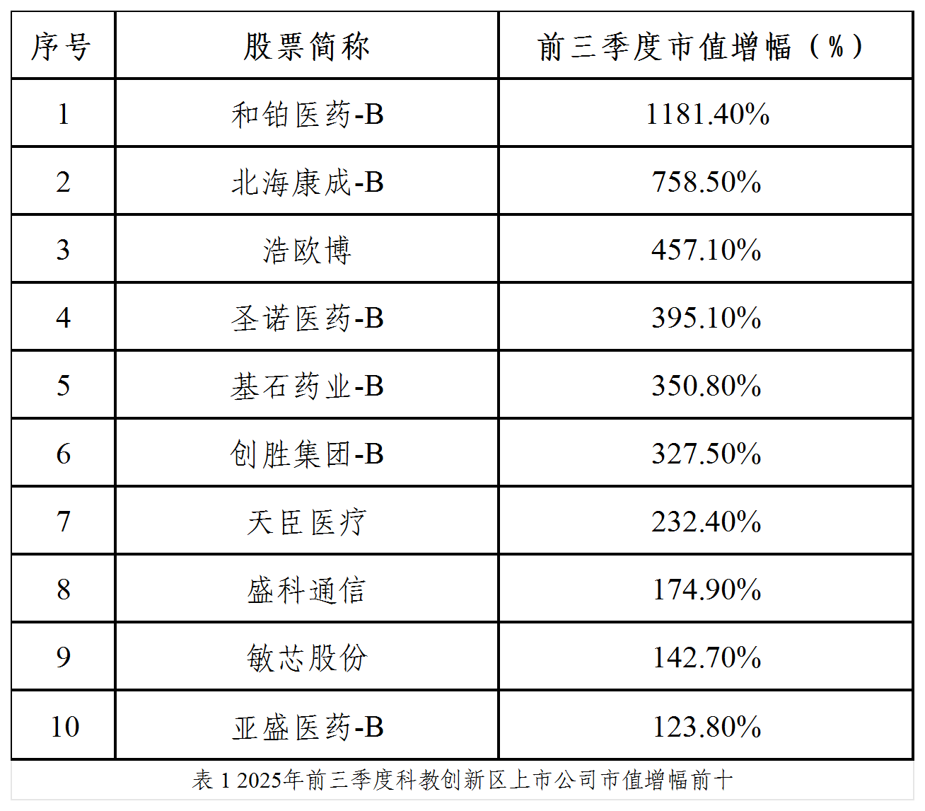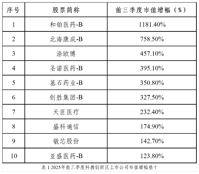 根據Wind數據,截至2025年三季度末,科教創新區46家上市公司總市值約5982億元,同比增長82.4%,充分展現出區域資本集聚效應。近九成企業市值實現同比增長,超半數企業增速超過50%,13家企業市值翻倍,市場信心充沛。其中,創新藥板塊強勢反彈,估值大幅修復,迎來“小陽春”。