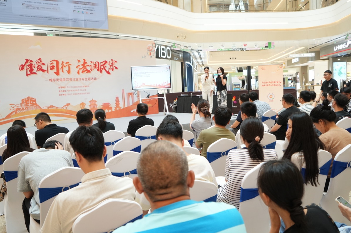 為切實提升民族宗教政策和法律法規覆蓋面與知曉度,增強園區居民民族宗教政策法規學習熱情,6月19日下午,由園區民宗局指導、唯亭街道辦事處承辦的“唯愛同行 法潤民宗”民宗政策法規主題宣傳活動在蘇州星湖龍湖天街圓滿舉辦。唯亭街道辦事處有關領導、唯亭街道各社區民宗干部及社會各族各界群眾代表等100余人參加本次活動。