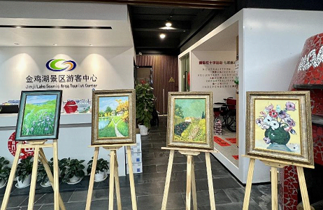 The oil painting exhibition themed “Flowers”, held at Jinji Lake Scenic Area Tourist Center, attracted many people.