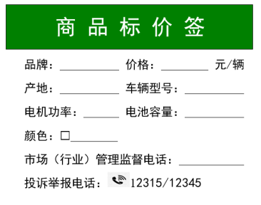 二、明碼標價,放心消費。經營者應當以顯著方式進行明碼標價,做到價簽價目齊全,標價內容真實準確。價格標簽或價目表等應包括品牌價格、車輛型號、計價單位、產地、顏色、電機功率、投訴舉報電話等信息。價格標簽和價目表推薦格式附后,供參考使用。