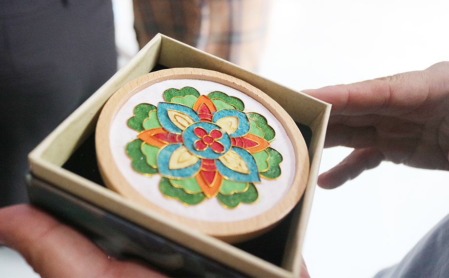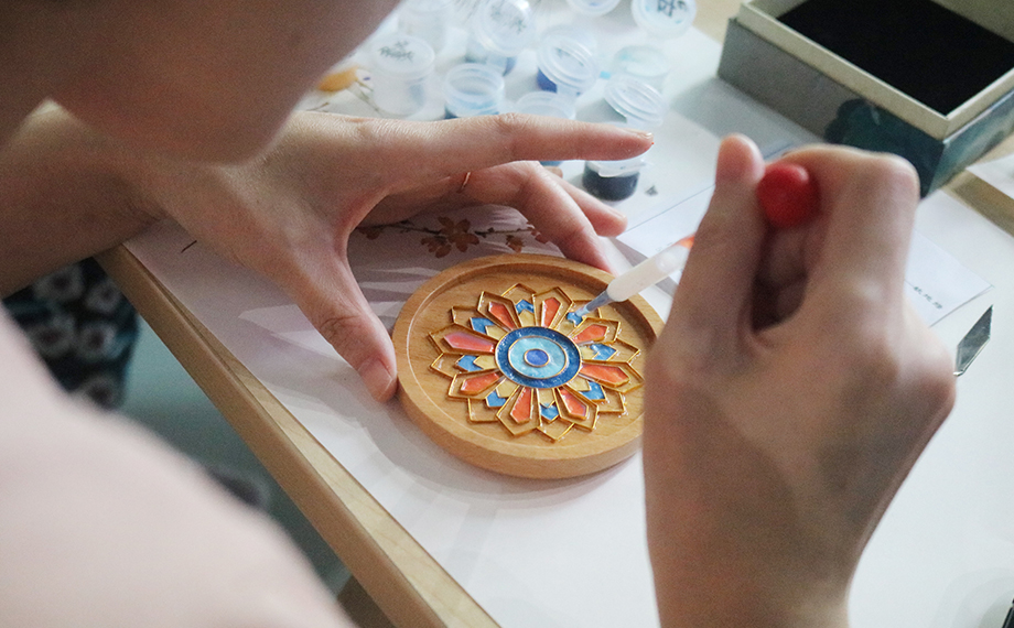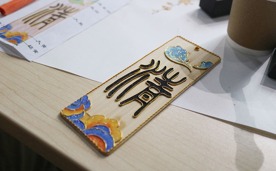 正是因?yàn)橐詼鬄榇淼牧汲純A力為民,社會(huì)才能進(jìn)步、時(shí)局才能穩(wěn)固,這也為乾隆時(shí)期景泰藍(lán)的復(fù)興創(chuàng)造了條件。景泰藍(lán),即掐絲琺瑯工藝,是中國(guó)的著名特種金屬工藝品類之一。在隨后的文化體驗(yàn)課環(huán)節(jié),大家興致勃勃地在老師的講解和幫助下參與到景泰藍(lán)手工技藝的體驗(yàn)活動(dòng)中,以金絲作胎,填充色釉,制作出屬于自己的景泰藍(lán)工藝蓮花杯墊、書簽、小鏡,用蓮心現(xiàn)廉韻,感受傳統(tǒng)文化魅力。